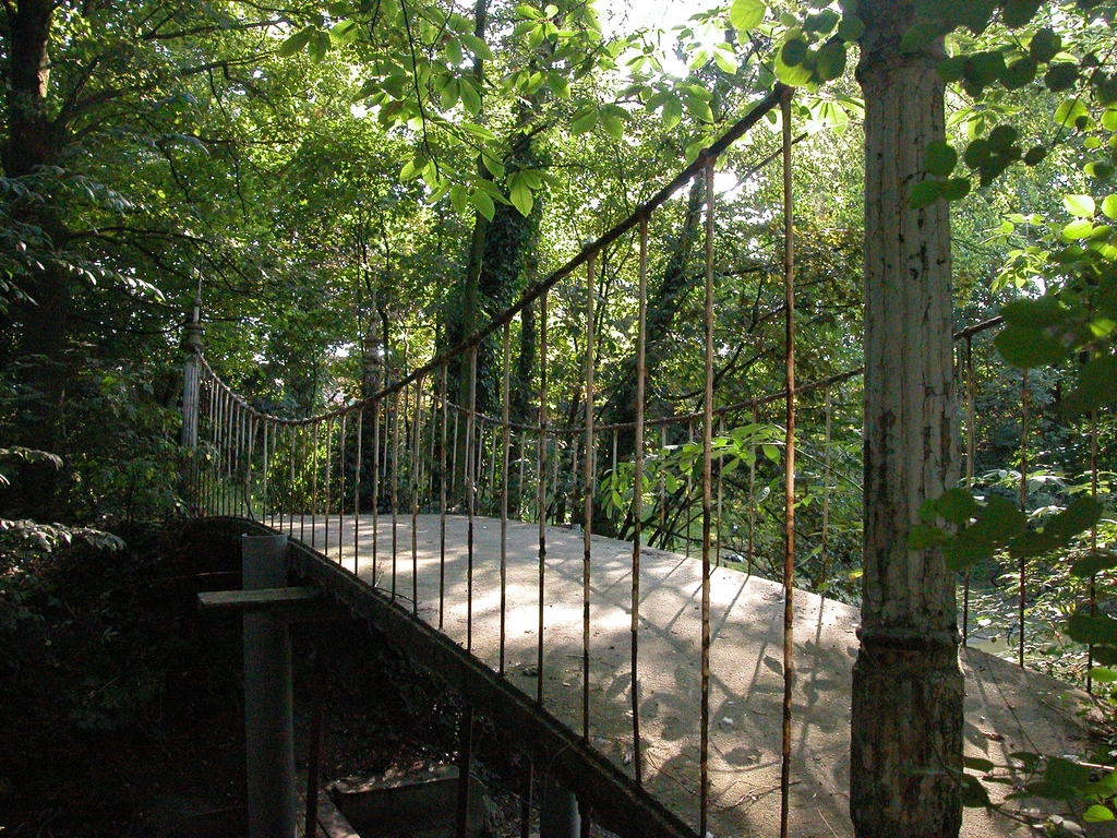 De afbeelding 'Tuin met gietijzeren brug' gemaakt door Lanclus, Kathleen wordt ter beschikking gesteld door Agentschap Onroerend Erfgoed (AOE) onder de volgende voorwaarden: Modellicentie voor gratis hergebruik, Naamsvermelding 4.0 Internationaal.