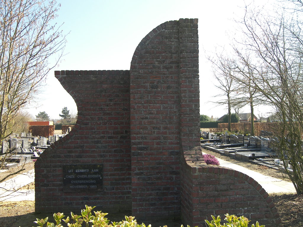 Bakstenen gedenkmonument bij de overbrenging van het kerkhof in 1985. Opschrift: "UIT EERBIED AAN ONZE OVERLEDENEN OVERBRENGING NOVEMBER 1985"