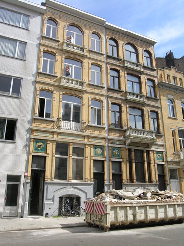 De afbeelding 'Samenstel van twee meergezinswoningen' gemaakt door Hooft, Elise wordt ter beschikking gesteld door Agentschap Onroerend Erfgoed (AOE) onder de volgende voorwaarden: Modellicentie voor gratis hergebruik, Naamsvermelding 4.0 Internationaal.
