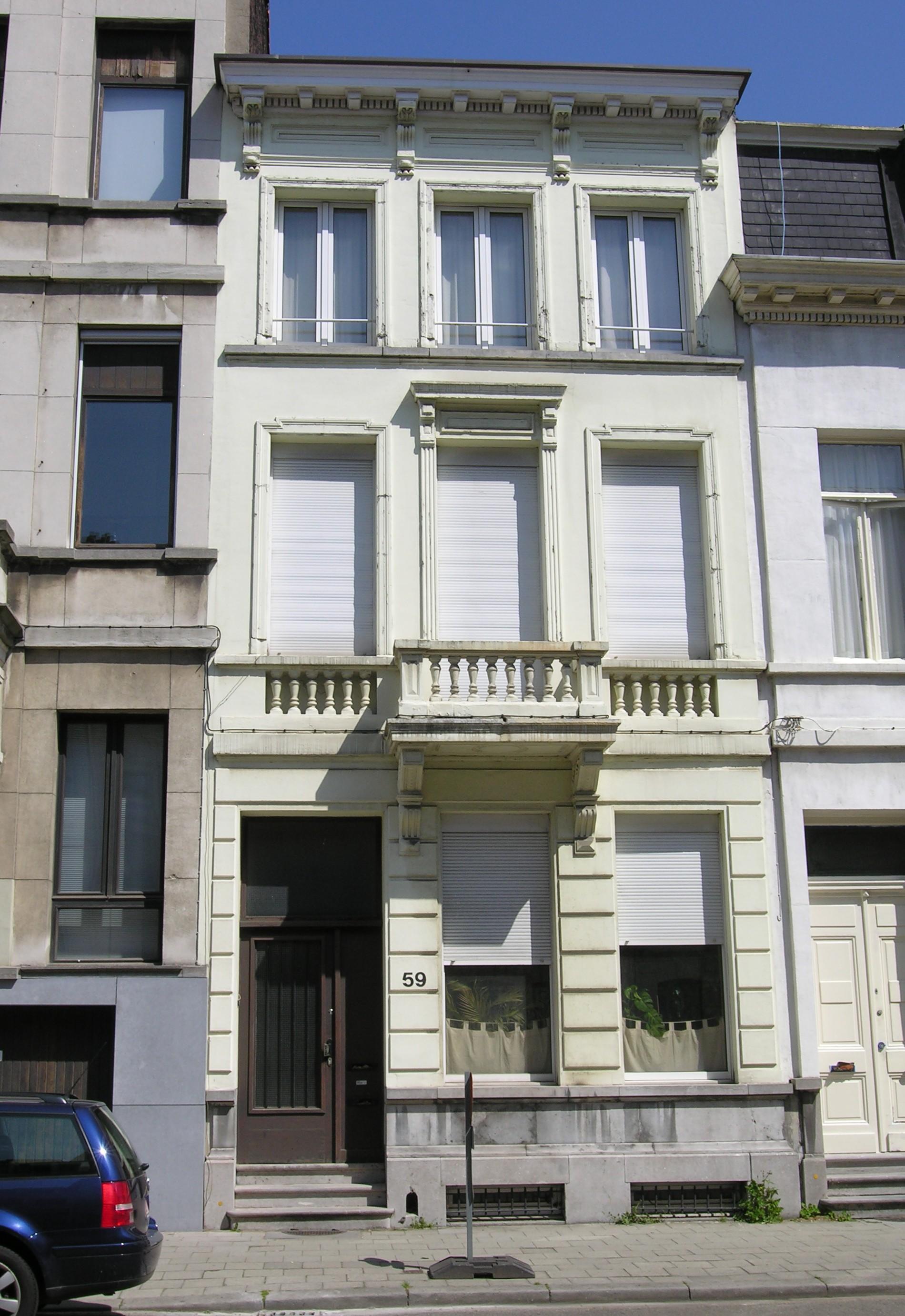 De afbeelding 'Antwerpen Pacificatiestraat 59' gemaakt door Hooft, Elise wordt ter beschikking gesteld door Agentschap Onroerend Erfgoed (AOE) onder de volgende voorwaarden: Modellicentie voor gratis hergebruik, Naamsvermelding 4.0 Internationaal.