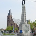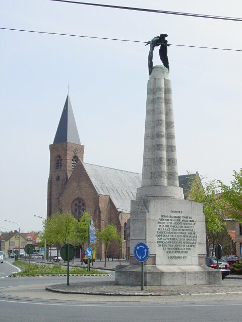 Gedenkteken voor Georges Guynemer met erachter de parochiekerk Onze-Lieve-Vrouw