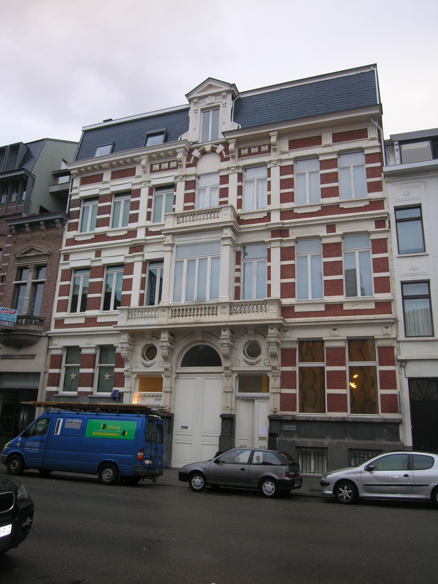 De afbeelding 'Samenstel van twee gespiegelde woningen in eclectische stijl' gemaakt door Hooft, Elise wordt ter beschikking gesteld door Agentschap Onroerend Erfgoed (AOE) onder de volgende voorwaarden: Modellicentie voor gratis hergebruik, Naamsvermelding 4.0 Internationaal.