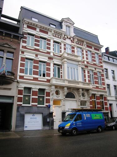 De afbeelding 'Samenstel van twee gespiegelde woningen in eclectische stijl' gemaakt door Hooft, Elise wordt ter beschikking gesteld door Agentschap Onroerend Erfgoed (AOE) onder de volgende voorwaarden: Modellicentie voor gratis hergebruik, Naamsvermelding 4.0 Internationaal.