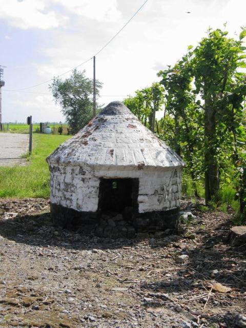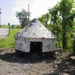 Centraal op het erf staat een conisch hondenhok in witbeschilderde baksteen.