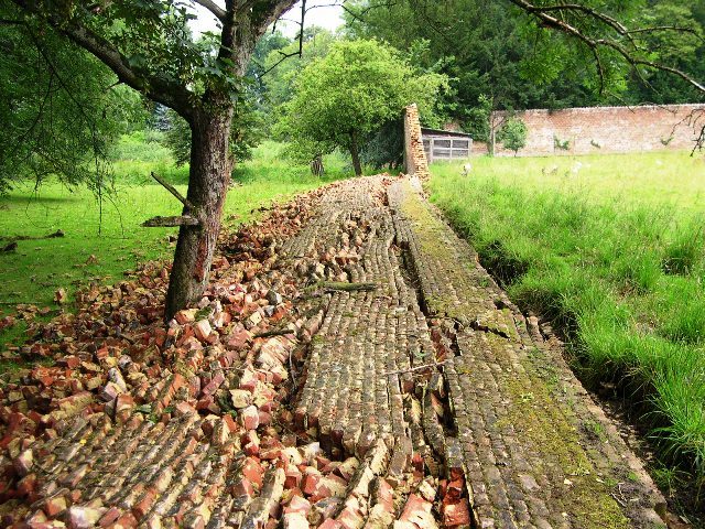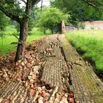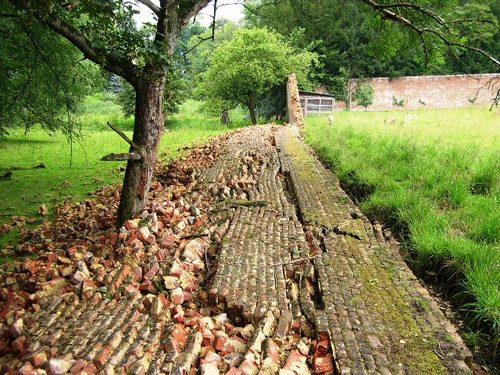 Omgevallen muur van de moestuin.