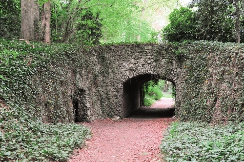 De 'Engelse' brug met de ingang van de grot bij het kasteel van Bouchout.