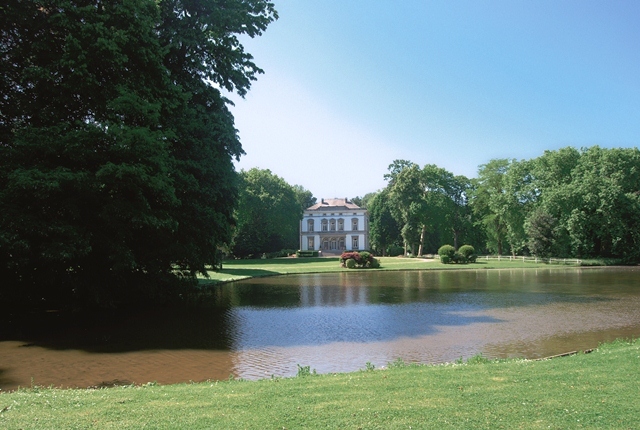 Het door Pangaert gebouwde kasteel omgeven door een landschappelijke ringvijver, relict van de oude ringgracht.