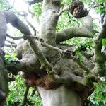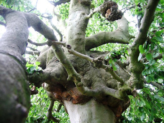 Een treurbeuk met knoestige gesteltakken.