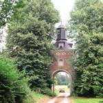De poorttoren, geflankeerd door twee Hollandse linden, relicten van de oorspronkelijke beplanting van een in 1738 aangelegde dreef.