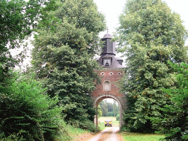 De poorttoren, geflankeerd door twee Hollandse linden, relicten van de oorspronkelijke beplanting van een in 1738 aangelegde dreef.