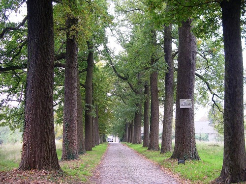 Met zomereiken afgezoomde oprijlaan van domein Morette