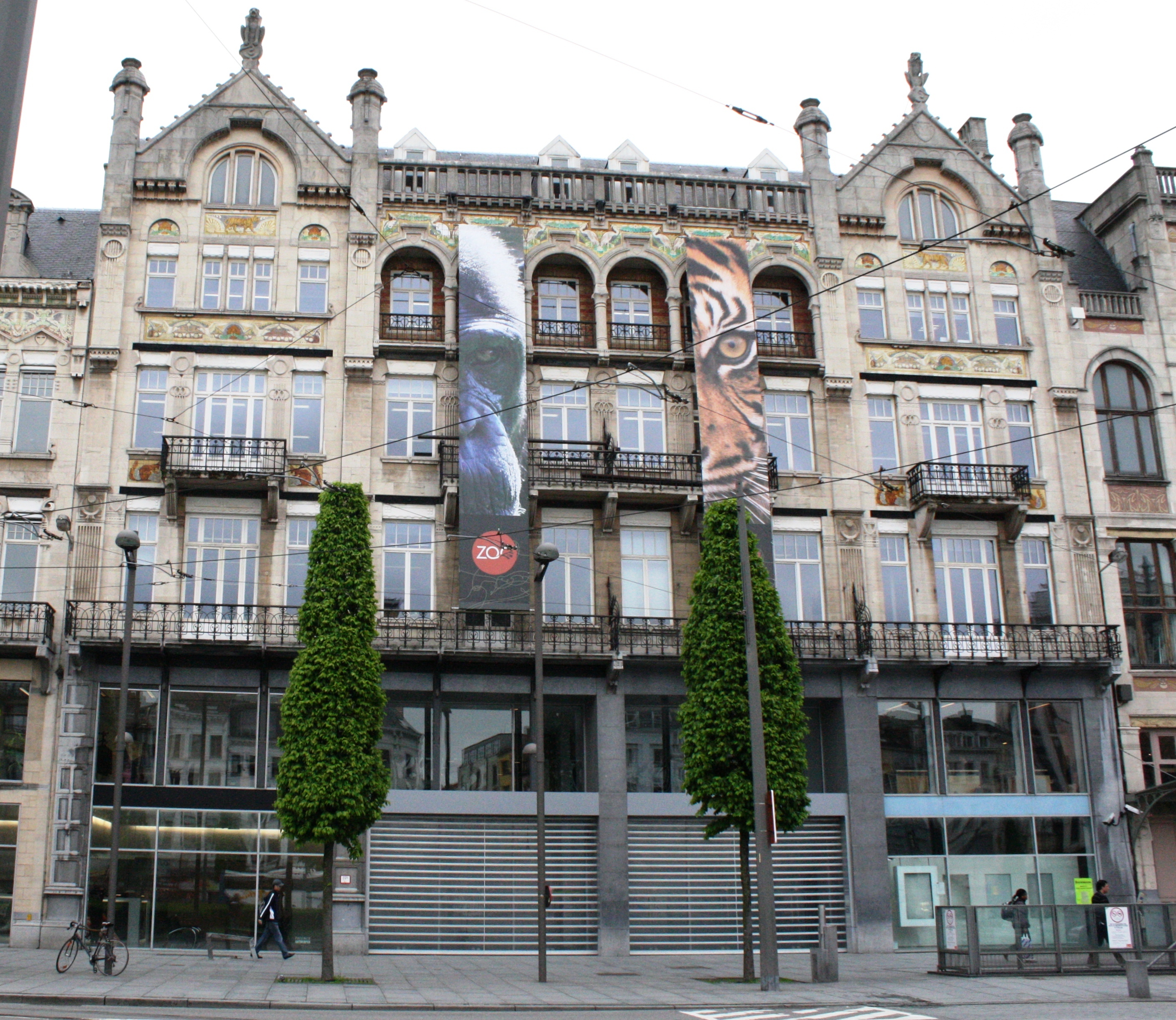 De afbeelding 'Vier winkelhuizen horend bij het complex van de dierentuin' gemaakt door Horemans, Charlotte wordt ter beschikking gesteld door Agentschap Onroerend Erfgoed (AOE) onder de volgende voorwaarden: Modellicentie voor gratis hergebruik, Naamsvermelding-GelijkDelen 4.0 Internationaal.
