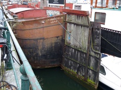 Het typische houten roer met lunette voor een gesleept binnenschip