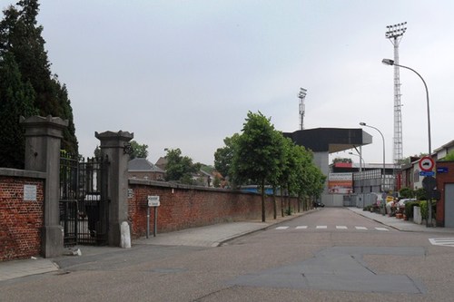 Vanaf de aansluiting met de Kerkhoflei, met links de oude hoofdingang naar de stedelijke begraafplaats en helemaal achteraan zicht op het stadion van KV Mechelen.