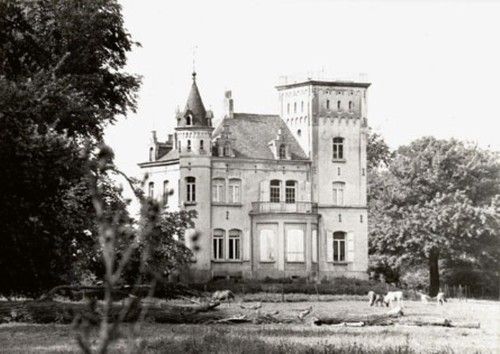 Het pittorseke neomiddeleeuwse 'Château de Huyenhoven' naar ontwerp van Antoine Trappeniers, voor de verbouwing, in een verwaarloosd park.