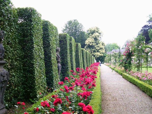 De haagbeukpalissade in de rozentuin.