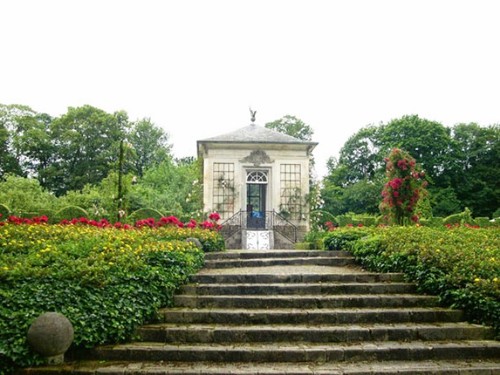 Het vierkante paviljoen in de rozentuin.
