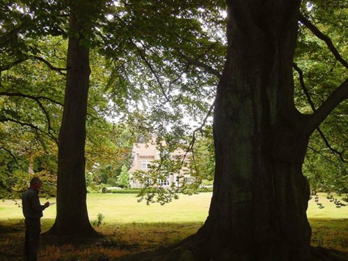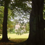 Het kasteel Lacourt of Villa All Right vanuit het rond 1870 aangelegde park, met oude bruine beuken op de voorgrond.