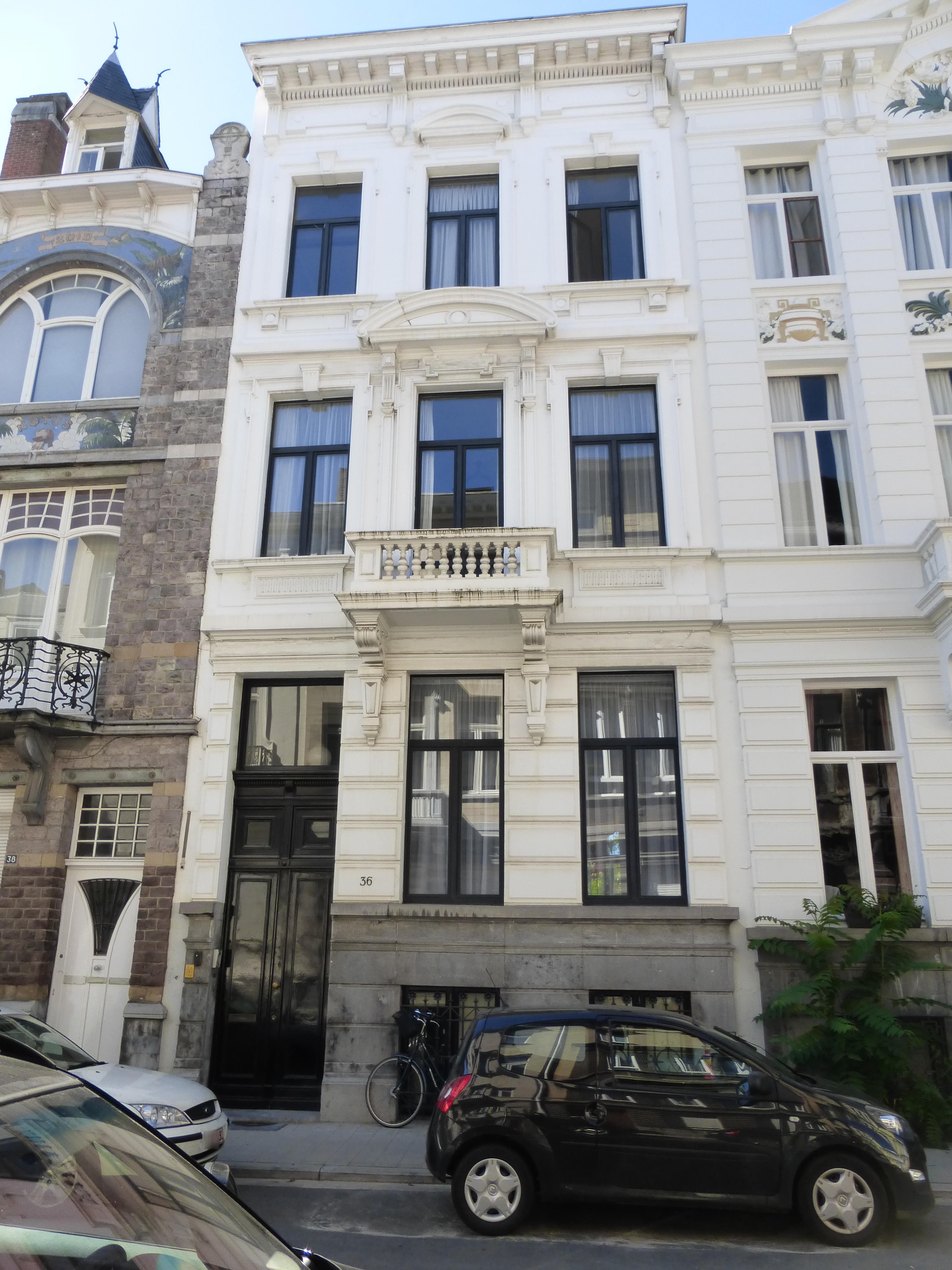 De afbeelding 'Ensemble van vier statige neoclassicistische huizen' gemaakt door Hooft, Elise wordt ter beschikking gesteld door Agentschap Onroerend Erfgoed (AOE) onder de volgende voorwaarden: Modellicentie voor gratis hergebruik, Naamsvermelding 4.0 Internationaal.