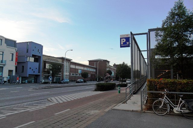 Rechts de parking die vermeld wordt in de beschrijving. Links de achterkant van de Hof van Nassau-school, waarvan de voorkant uitgeeft op het Berthoudersplein.