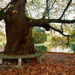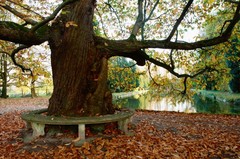Eén van de 18de-eeuwse tamme kastanjes en op de achtergrond het met zuilen, hinokischijncipressen en taxusbollen afgezoomde 'kanaal', voorbeeld van een door klassieke modellen geïnspireerde aanleg uit het interbellum.