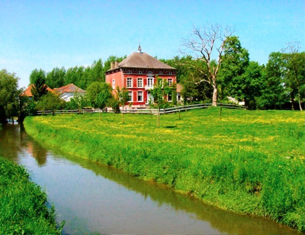 Het kasteeltje van Ter Lenen met relicten van een sierbeplanting uit het einde van de 19de eeuw: de mezzanine onder het overkragende leien schilddak met klokkenruiter is typisch voor een groot aantal landhuizen in de regio gebouwd in de periode 1840-1865.