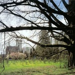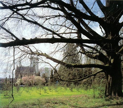 Het kasteel van Meldert vanuit het oosten met op de voorgrond een bruine beuk, mogelijk een rond 1850 aangeplante 'bundelboom'.