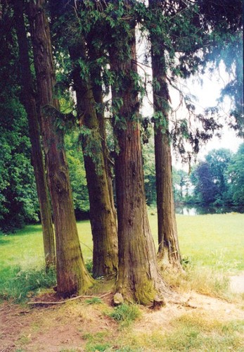 De vijver bij het kasteel A Speculo met hinokischijncipressen op de voorgrond.