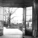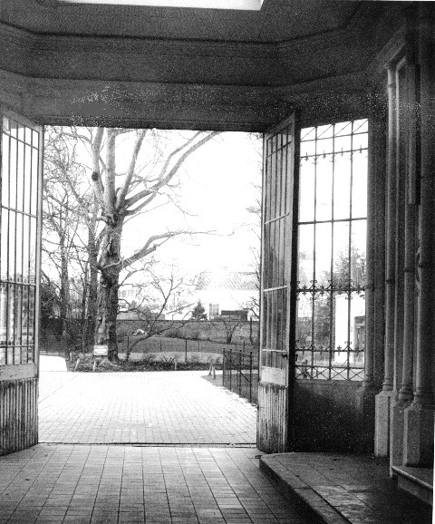 De tuin gezien vanuit de in 1875 herbouwde poortdoorgang, een ginko op de voorgrond.