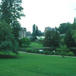 De vijver met de vijf moerascipressen, de achterzijde van de Villa Van Goidsnoven, de torenspits van de Villa Piercot aan de overzijde van de Stationsstraat, links op de voorgrond, de beuk met gedraaide takken;