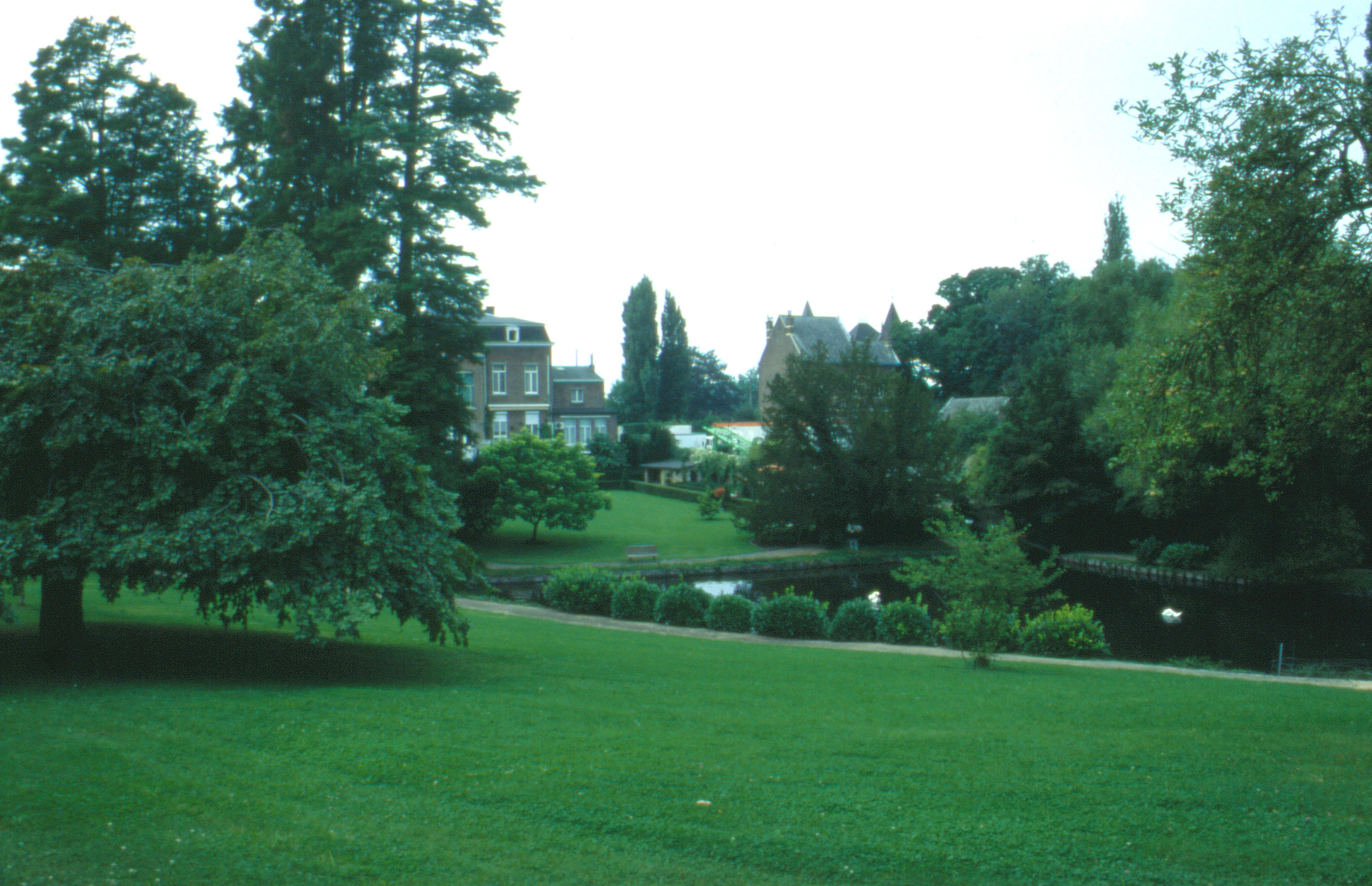 De vijver met de vijf moerascipressen, de achterzijde van de Villa Van Goidsnoven, de torenspits van de Villa Piercot aan de overzijde van de Stationsstraat, links op de voorgrond, de beuk met gedraaide takken;