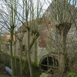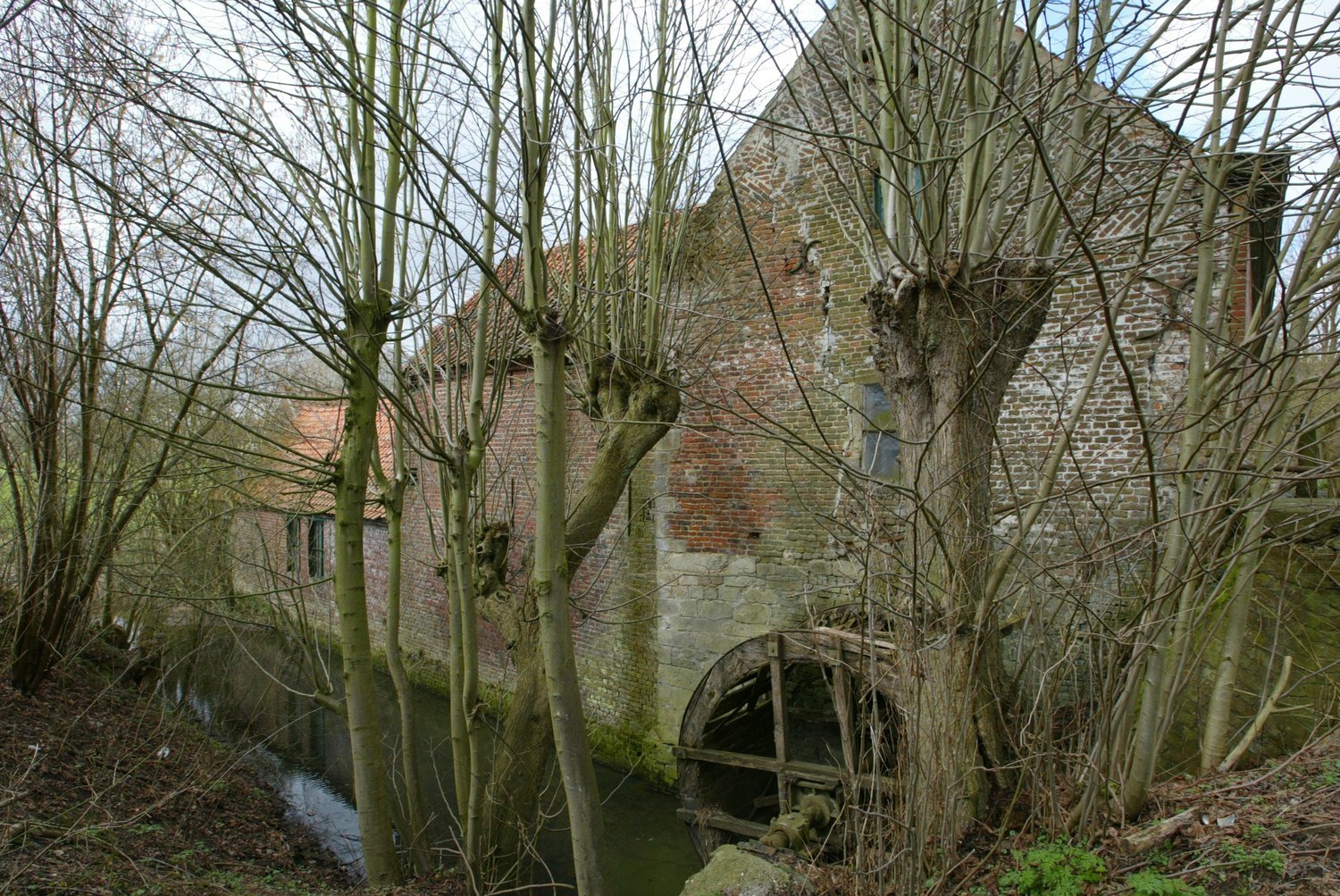 schutsbomen (geknotte linden) bij houten rad van watermolen