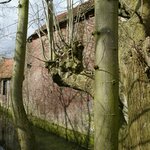 schutsbomen (geknotte linden) bij houten rad van watermolen