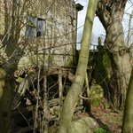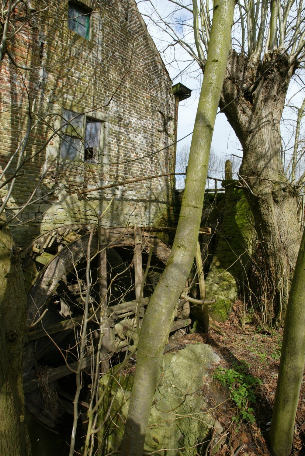 schutsbomen (geknotte linden) bij houten rad van watermolen