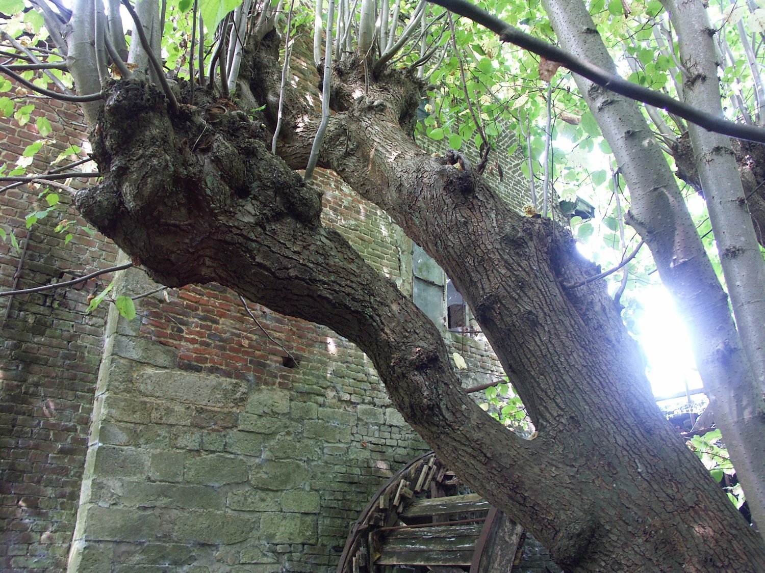 schutsbomen (geknotte linden) bij houten rad van watermolen