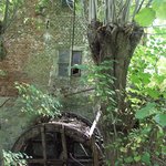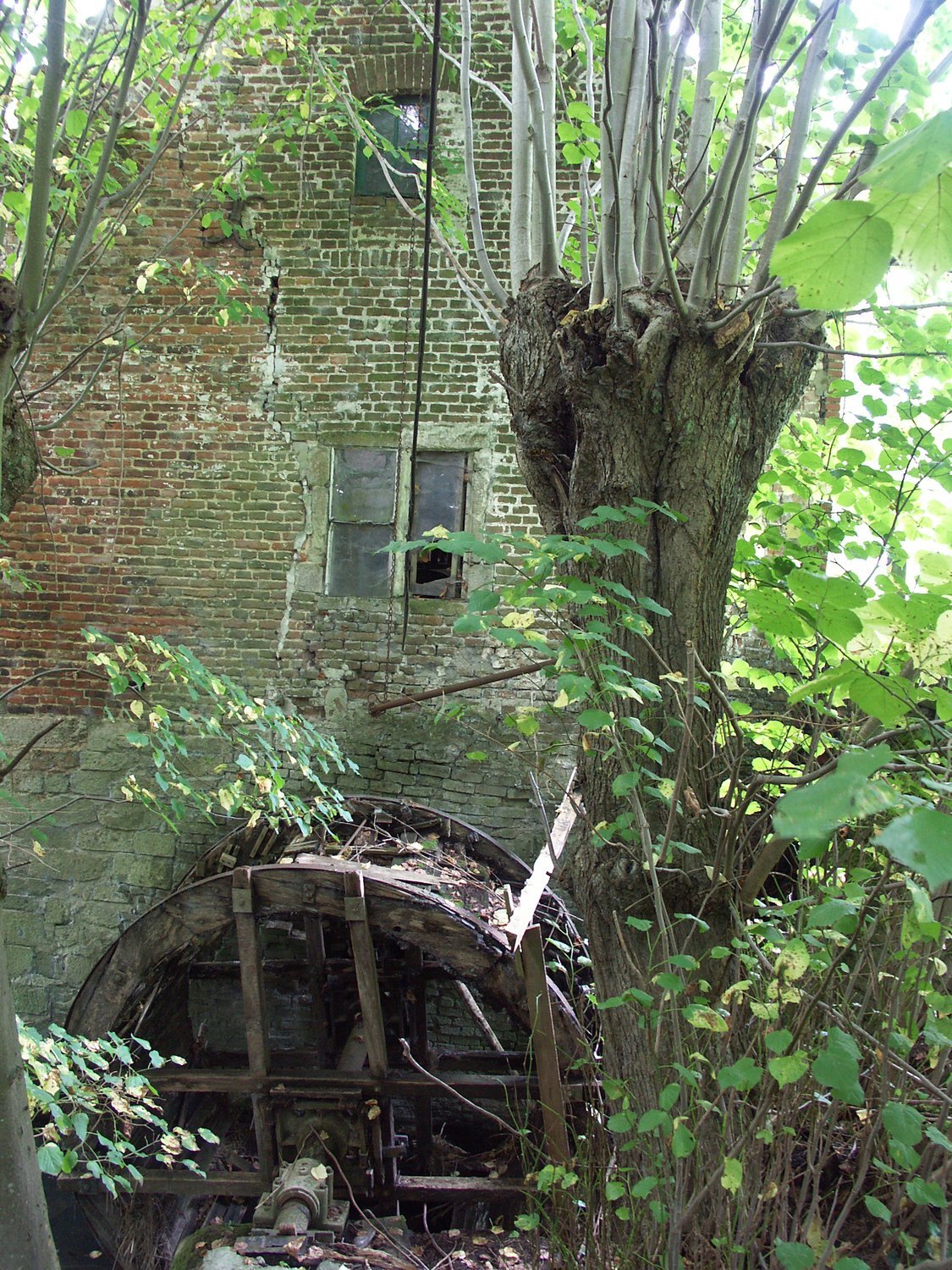 schutsbomen (geknotte linden) bij houten rad van watermolen