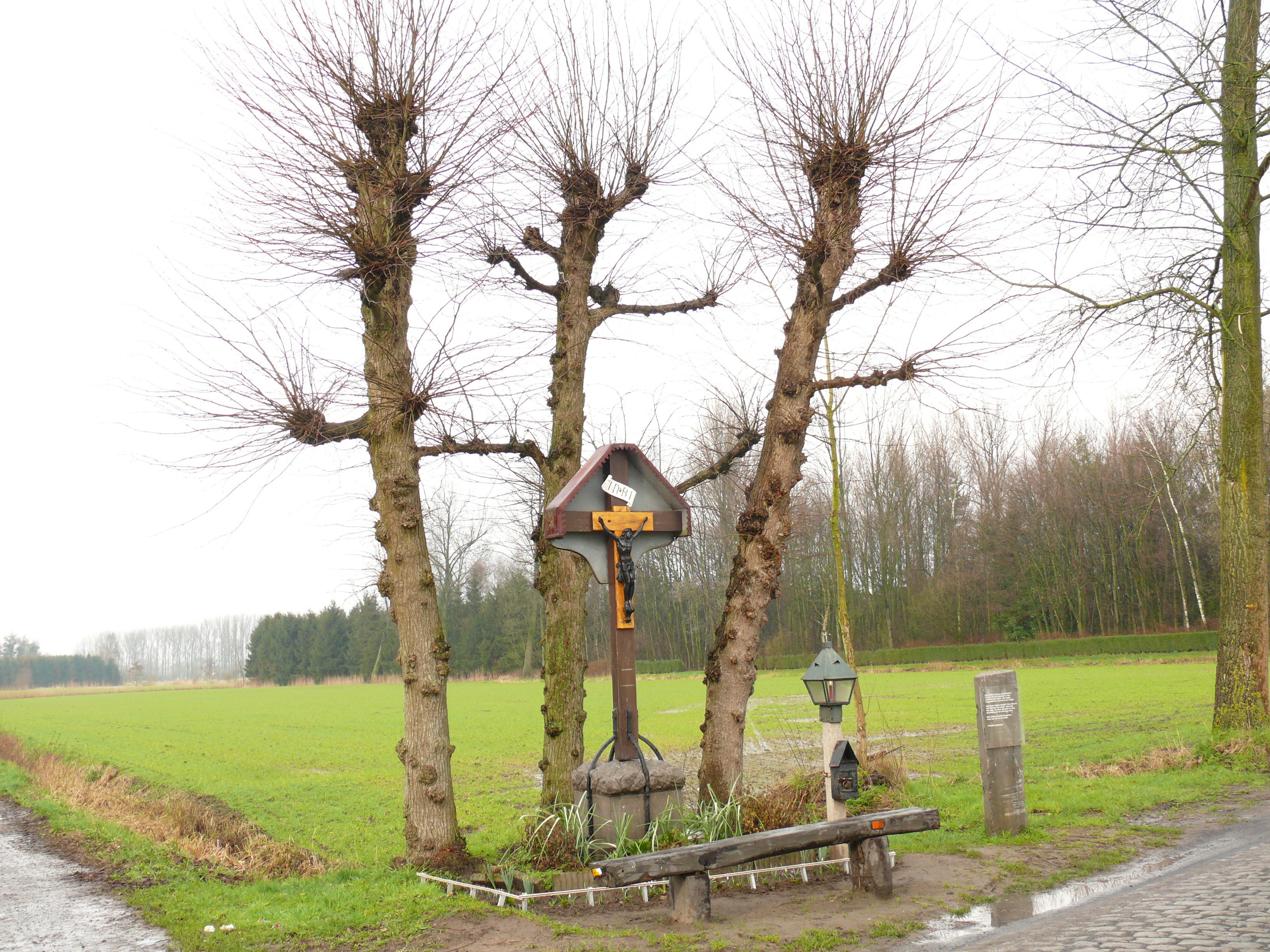 Waterstraat. Veldkruis. Drie gekandelaarde linden.