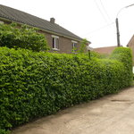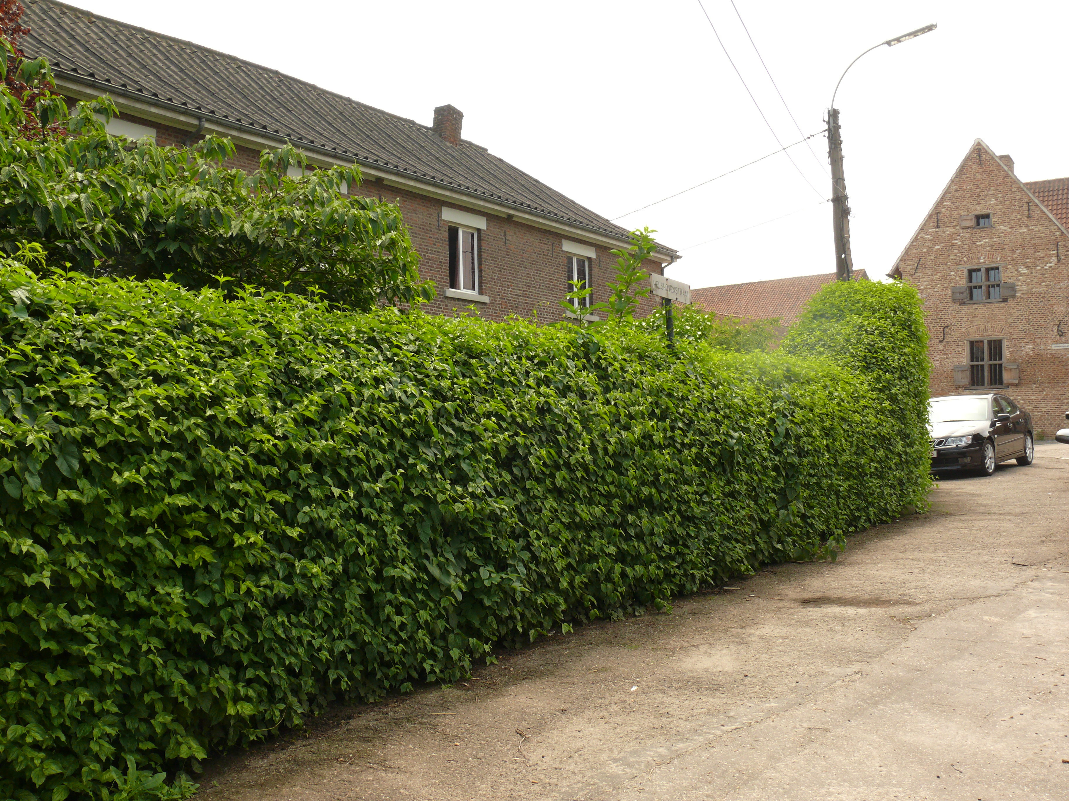 Helshovenstraat. Geschoren haag. Gele Kornoelje.