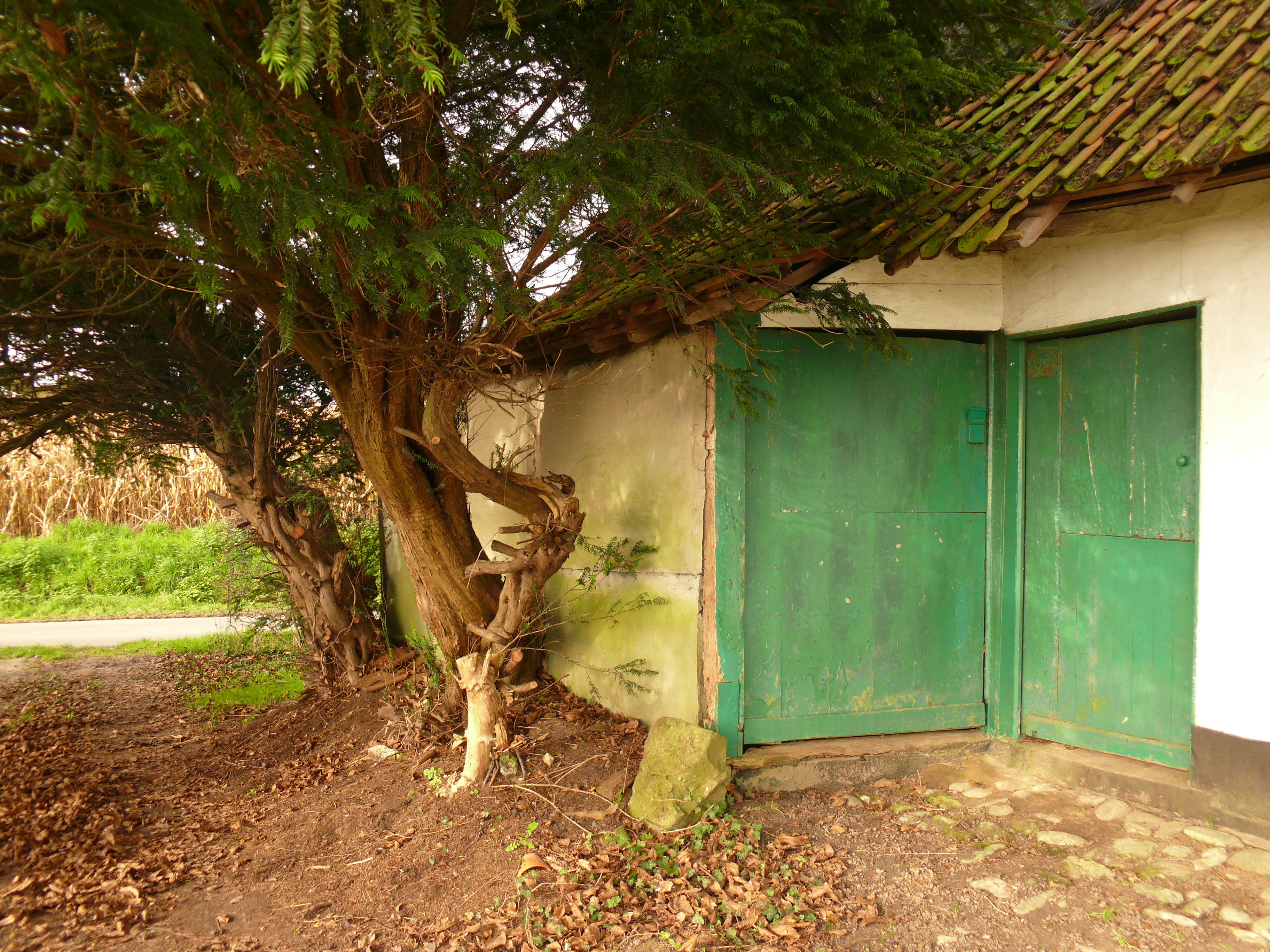 Van Repinghens huizeken. Erfbeplanting. Taxushaag.