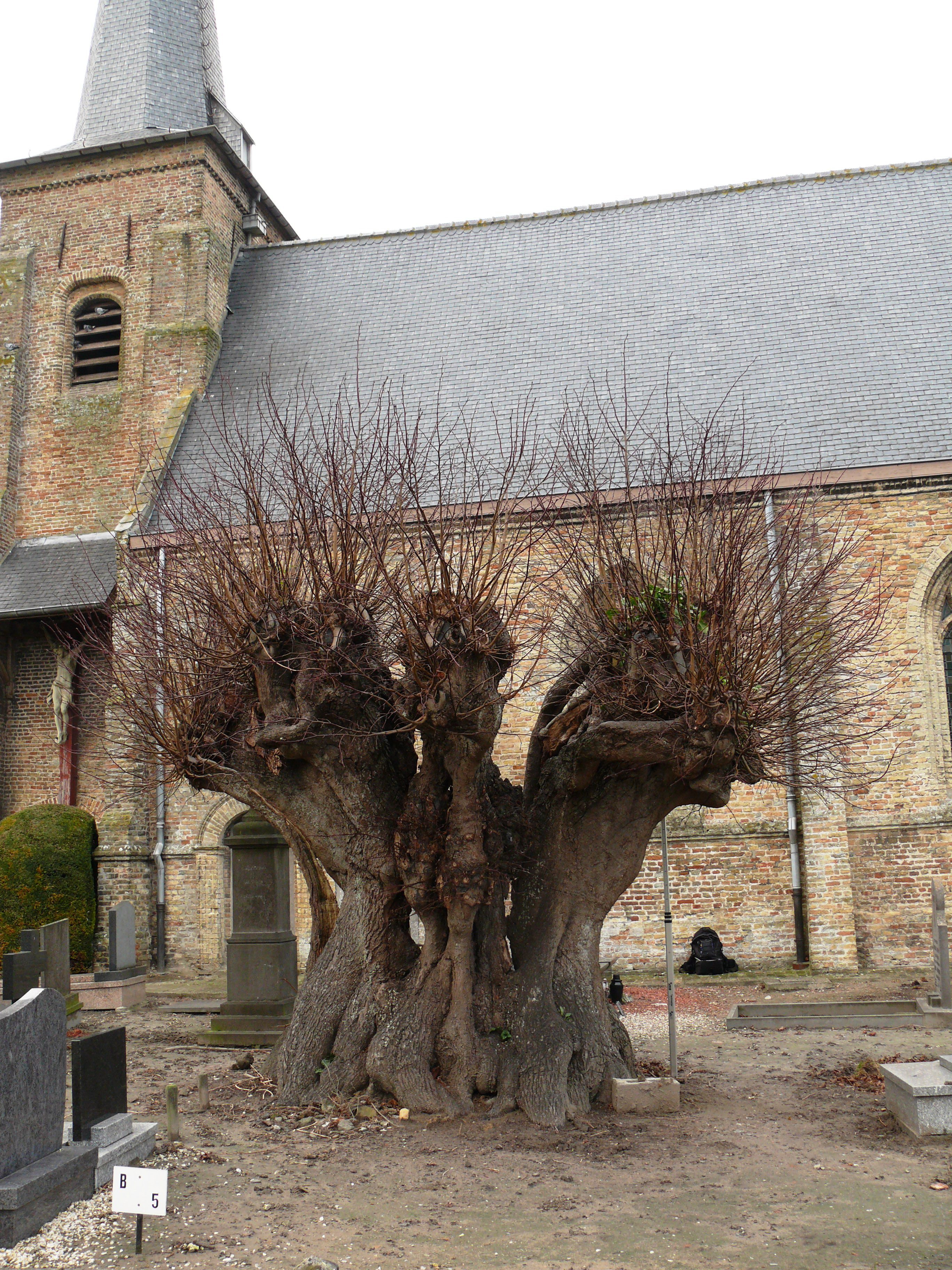 Veurne_Avekapelle_Geknotte zomerlinde op kerkhof Sint-Michielskerk