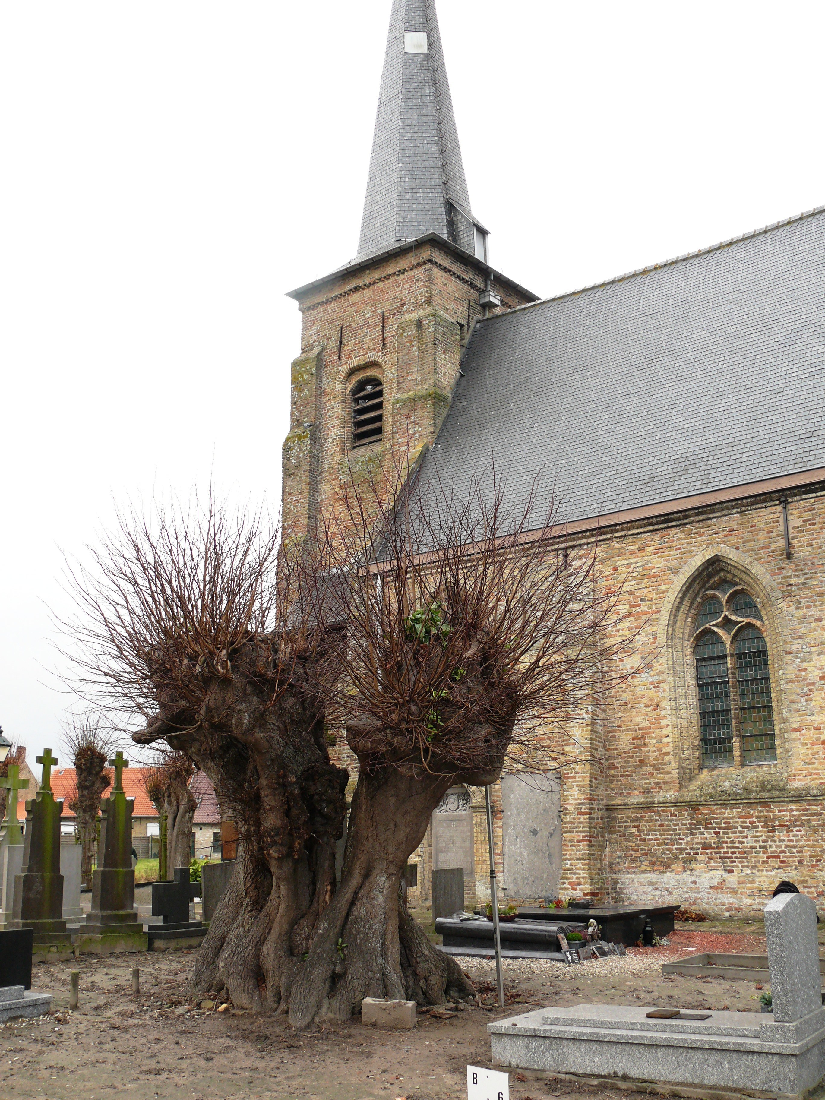Veurne_Avekapelle_Geknotte zomerlinde op kerkhof Sint-Michielskerk