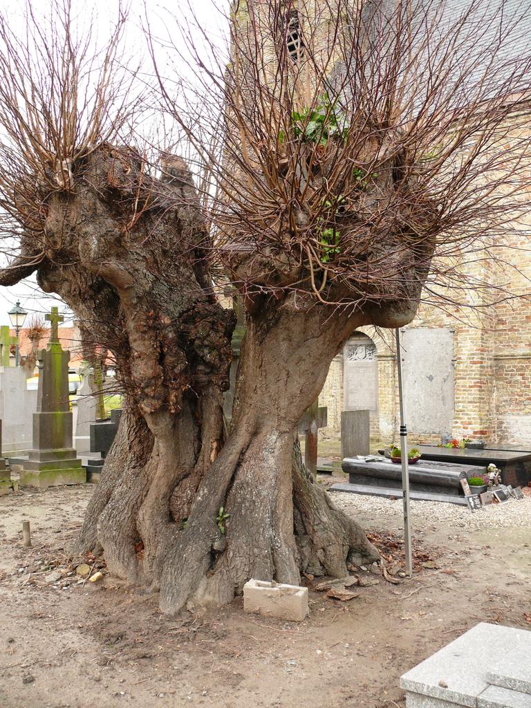 Veurne_Avekapelle_Geknotte zomerlinde op kerkhof Sint-Michielskerk