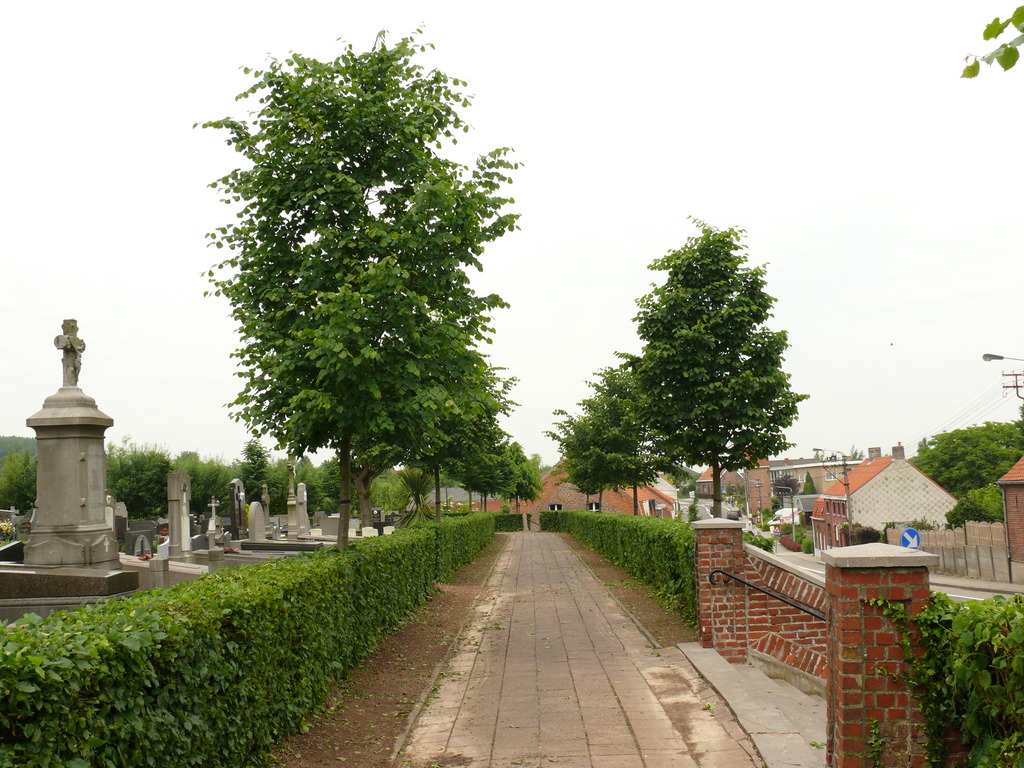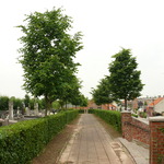 Heuvelland (Kemmel) St.-Laurentiusplein Kerkhofbeplanting met Kerkhofbeplanting met afsluitingshaag van haagbeuk en opgaande bomenrijen van linde (8)