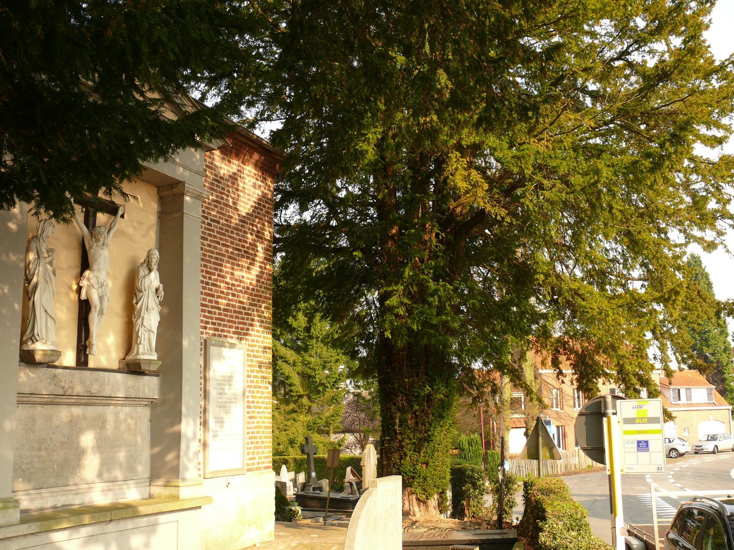 De afbeelding 'Twee op stam gezette taxussen kerkhof Leeuwergem' gemaakt door Van der Linden, Geert wordt ter beschikking gesteld door Agentschap Onroerend Erfgoed (AOE) onder de volgende voorwaarden: Modellicentie voor gratis hergebruik, Naamsvermelding 4.0 Internationaal.