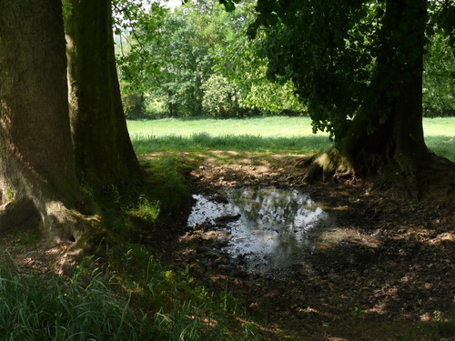 Bomengroep bij poel. Vijf opgaande bomen.