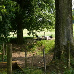 Bomengroep bij poel. Zes opgaande bomen.
