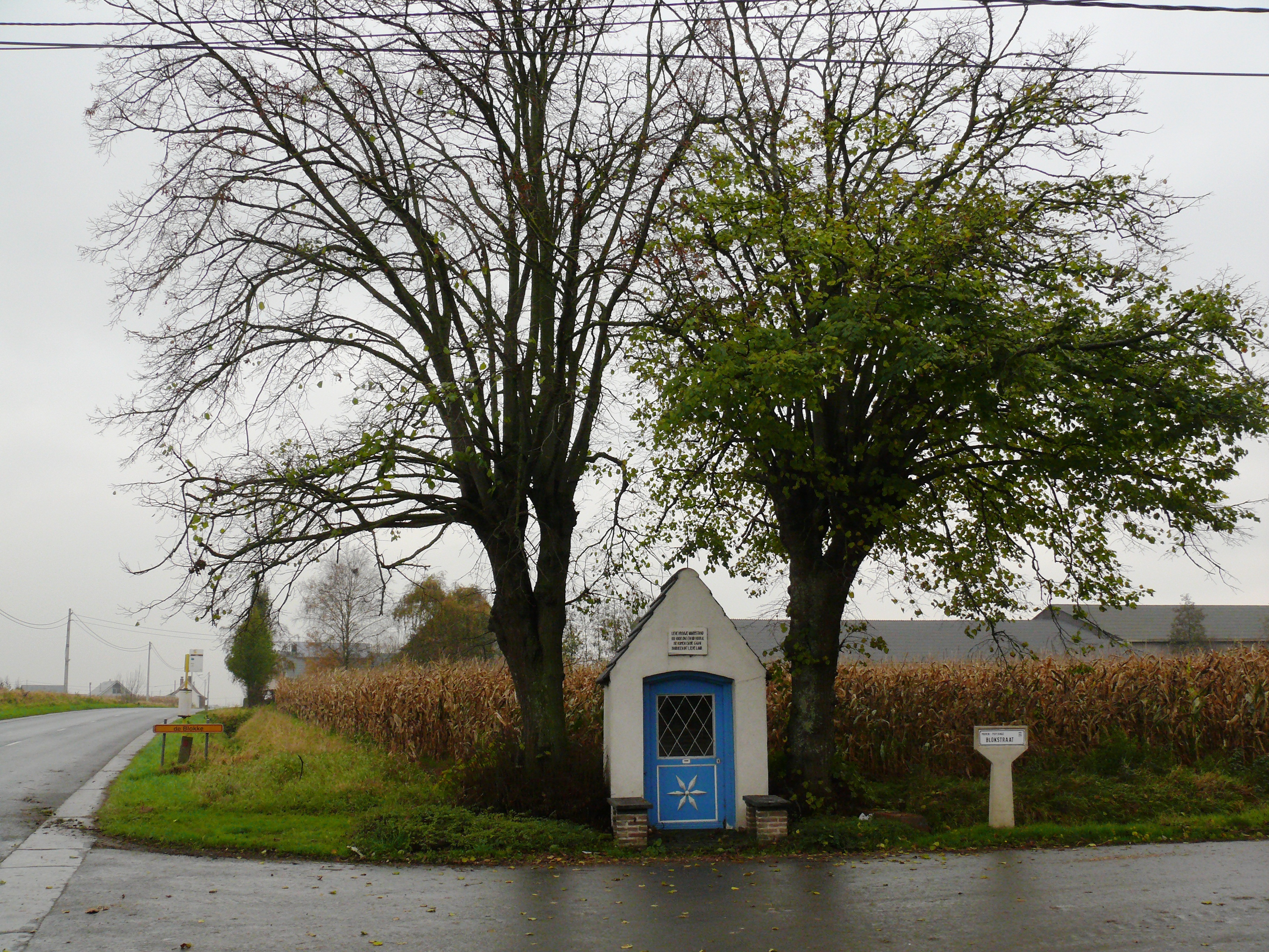 Blokstraat. Twee knotlinden bij wegkapel.