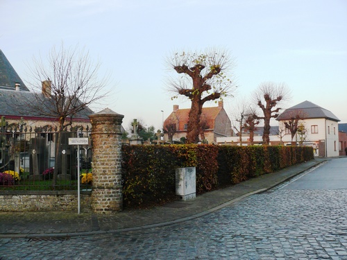 Kerkhof. Gekandelaarde lindenrij. Afsluitingshaag Haagbeuk.