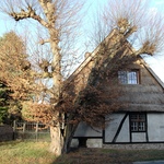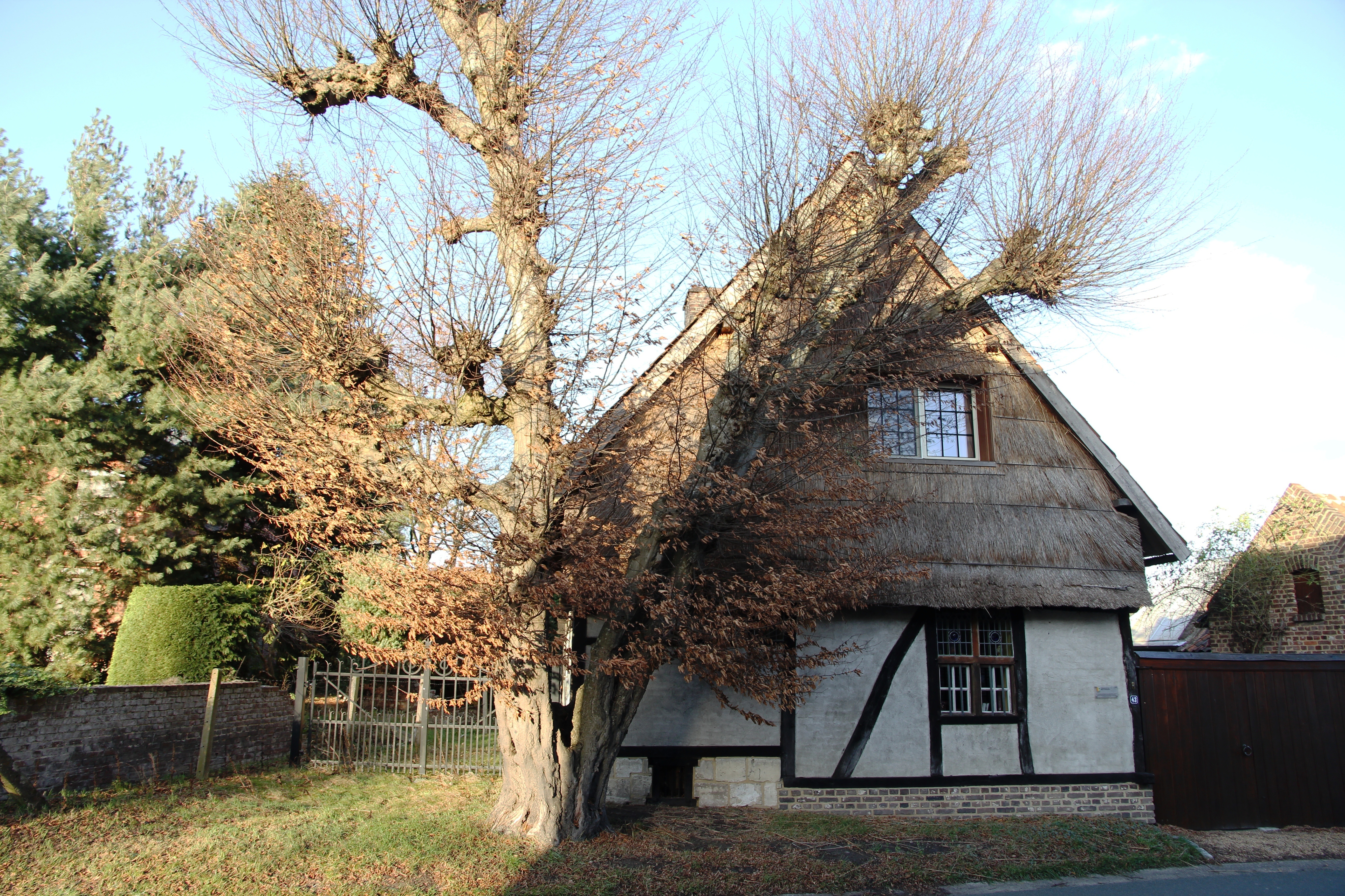 Tweestammige haagbeuk bij vakwerkbouw.