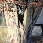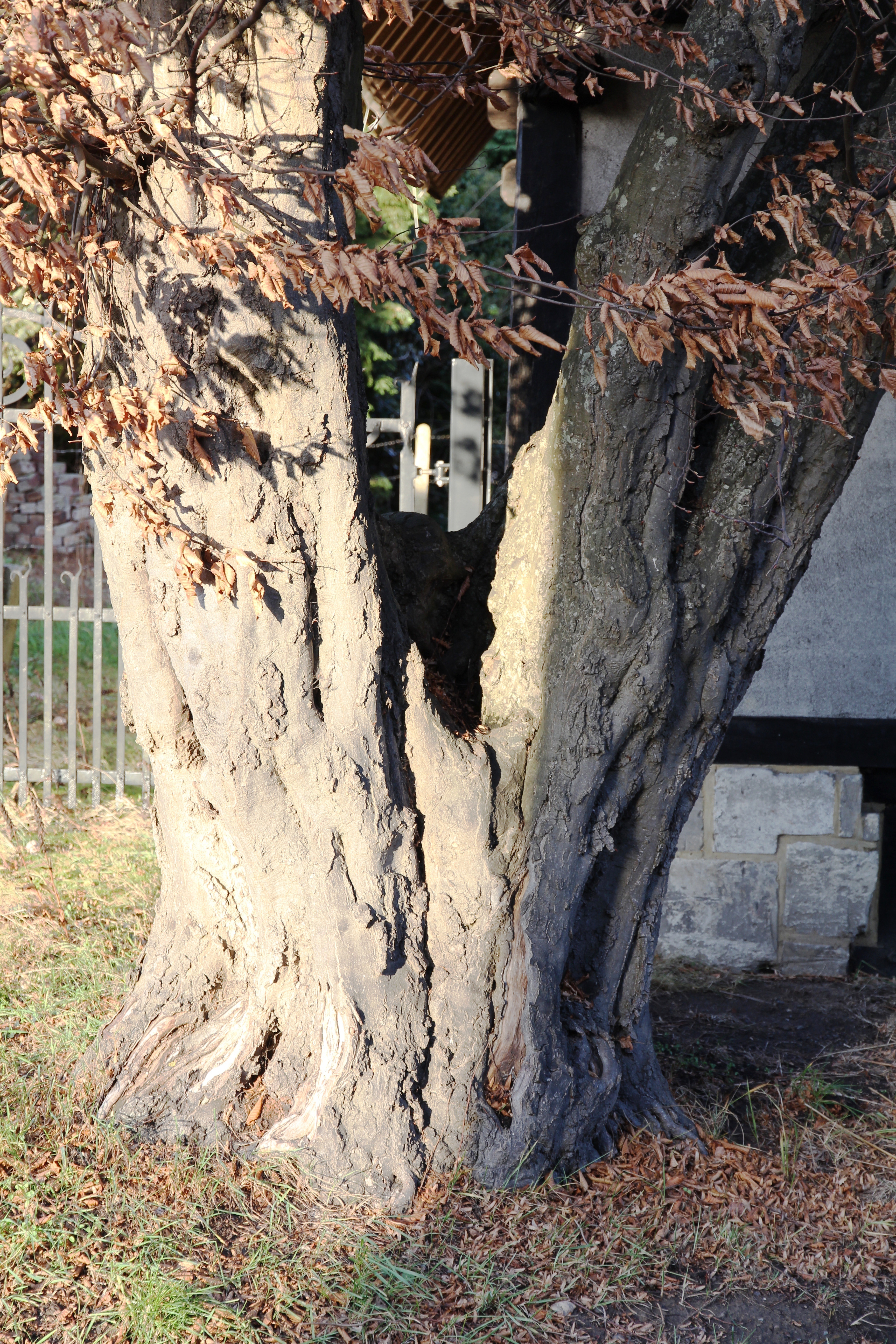 Tweestammige haagbeuk bij vakwerkbouw.